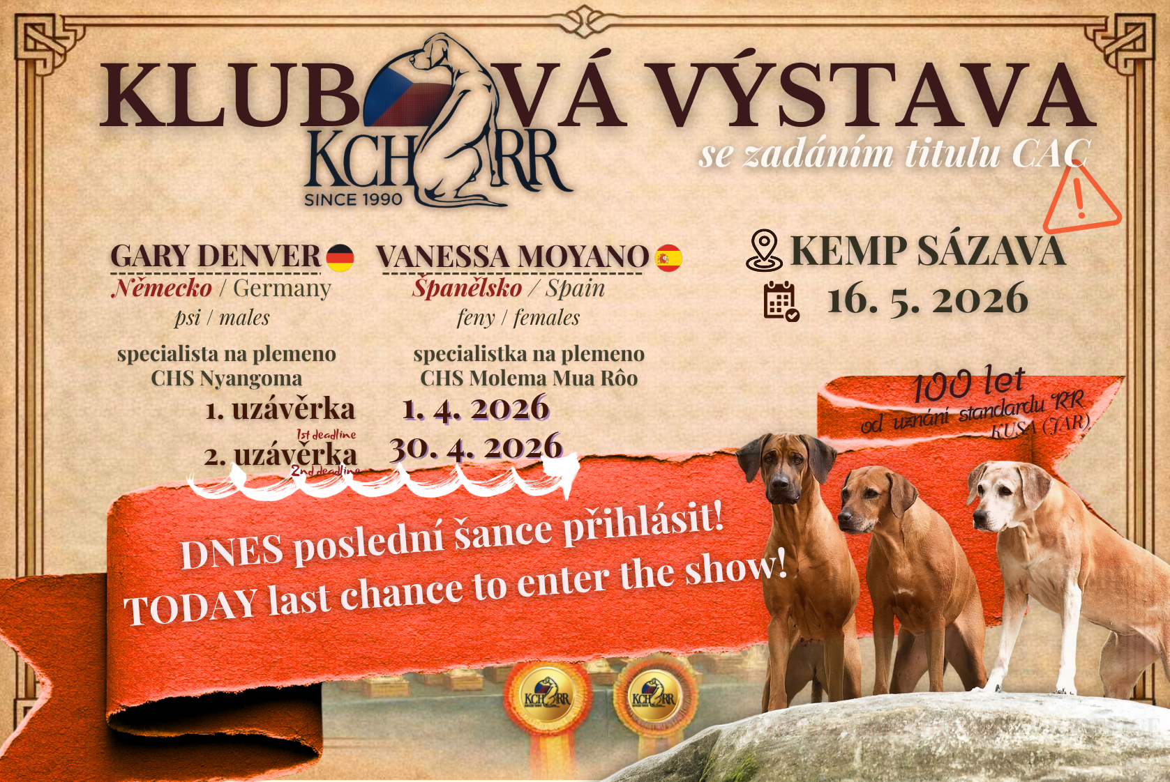Srdečně VÁS zveme na květnovou výstavu KCHRR - 16. 5. 2026, která se bude konat v kempu Sázava. Tato výstava se ponese v duchu 🫶 100 let od uznání standardu RR - KUSA (JAR).